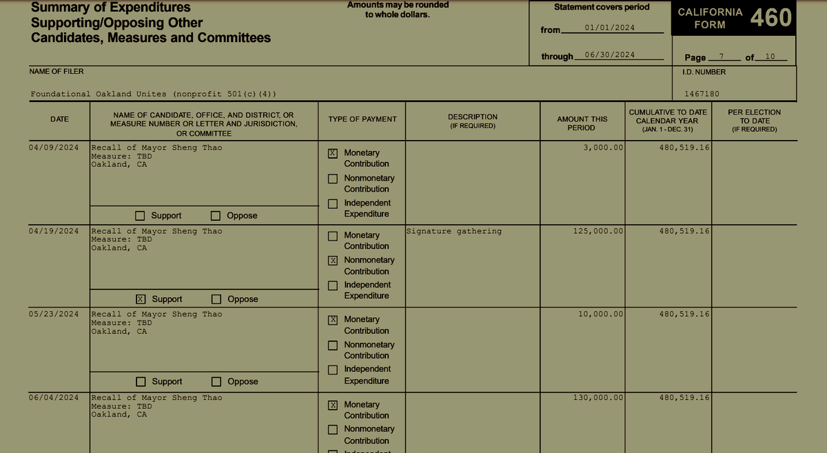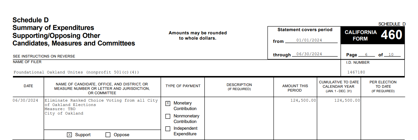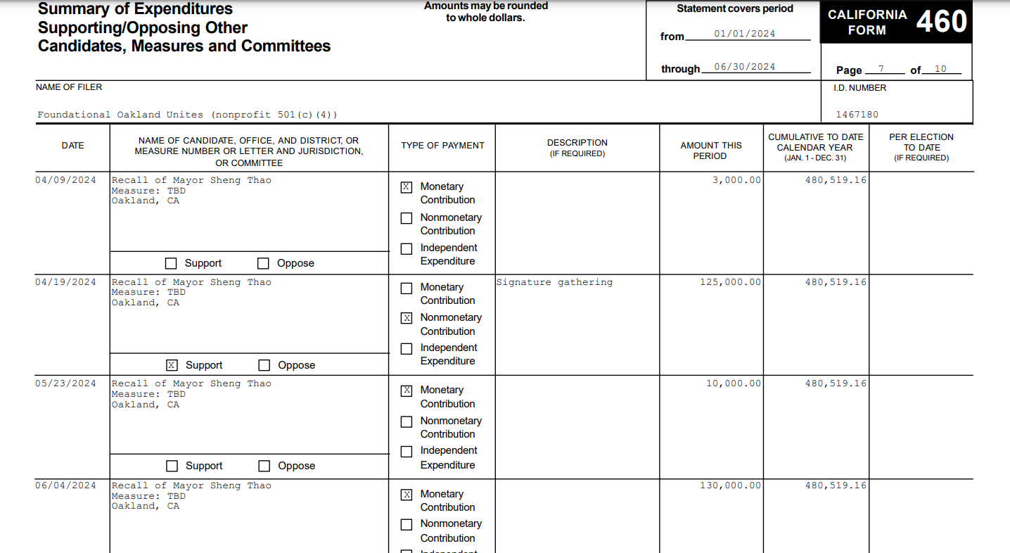According to FOU’s campaign finance report, Dreyfuss’ $605K in donations are the only contributions received by FOU by June 30, the last day of the filing period. On that date, several weeks after the signatures for the Thao recall were turned in, Dreyfuss donated one last contribution of $124.5K to FOU. On the same day, FOU donated the same amount to another committee called Coalition to Reclaim Oakland's Committee to Repeal Ranked Choice Voting“ [sic].