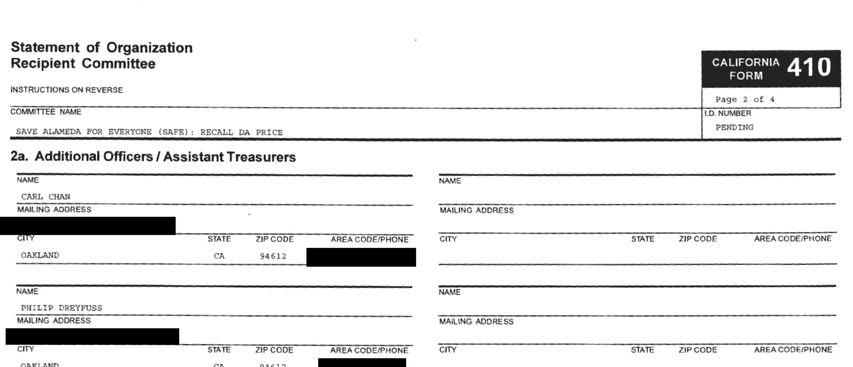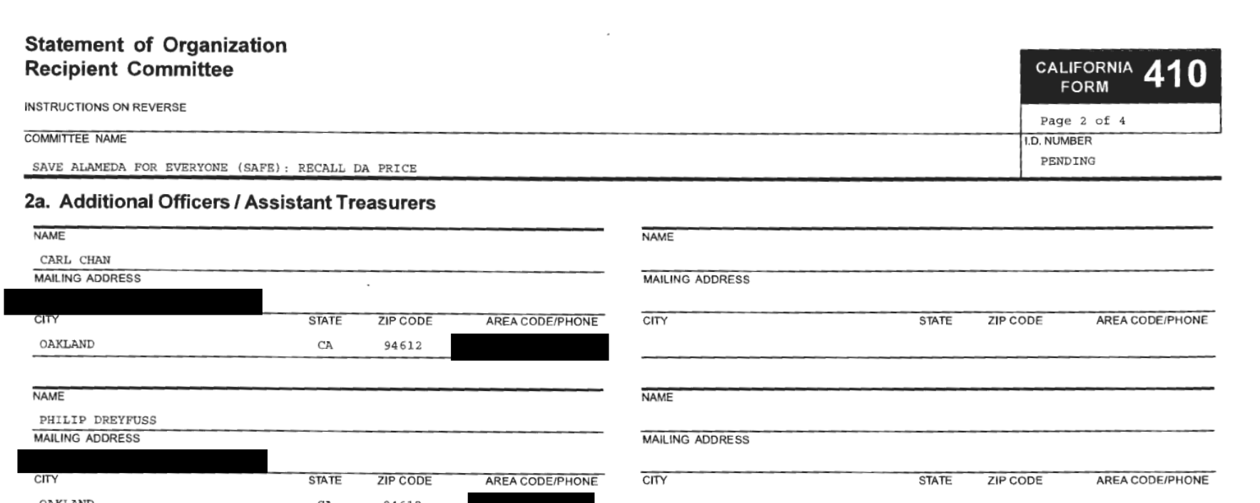 The "general" reporting requirements mean that in both cases, a large proportion of signatures in the Price recall, and all of them in the Thao recall, were gathered before the identity of the main financiers of the recalls was publicly known***. Instead, legal requirements on the petition pages and on associated websites showed only the names of the committees funneling the payments. RBA initially followed the rules for a general committee, missing a third-quarter "primary" reporting deadline which would have revealed Dreyfuss as one of the primary funders of RBA and thus, the Price recall effort. In December, after an attorney representing the Pamela Price campaign sent a complaint to the Fair Political Practices Commission [FPPC], RBA was rebranded as Supporters of Recall Pamela Price and its designation changed to primary.