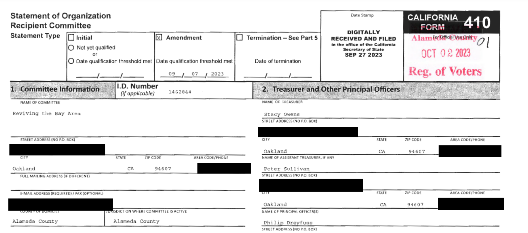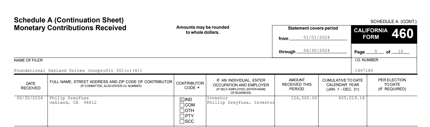 Though several people have been associated with the organization, only Leonard Raphael, an Oakland resident, remains as a principal on the finance committee. Raphael is also running for the D1 seat, but has raised almost no funds independently, according to his 460 report released the same week. Tanya Boyce, a principal in the 501 c 4, was removed from the list of principals on FOU’s campaign finance committee in documents submitted on July 31, 2024.