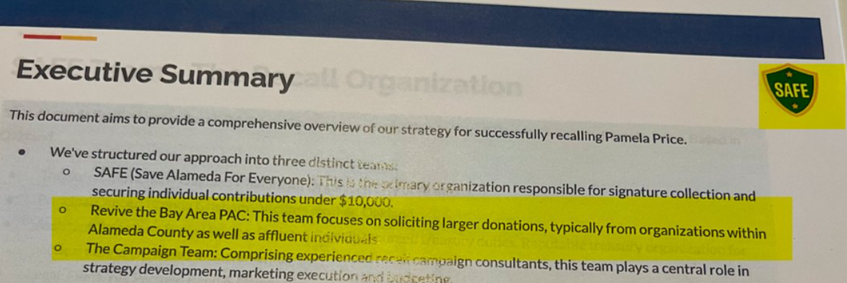 A leaked SAFE campaign document confirmed as authentic by Grisham states clearly that it was the intention of the recall proponents to initiate two separate funding arms–RBA was intended for large donors and was started by Dreyfuss.