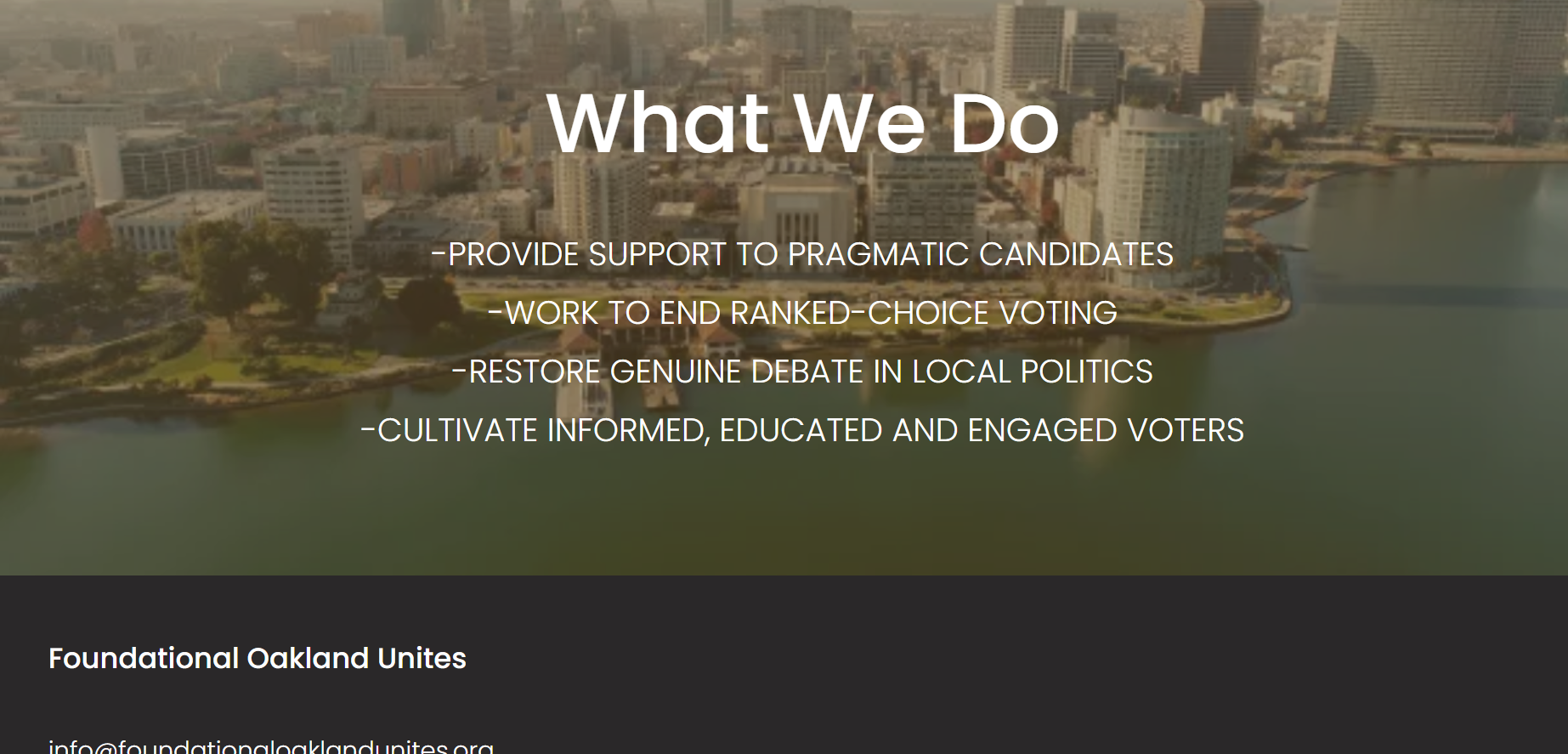 Though FOU is ostensibly the campaign finance arm for Foundational Oakland United, a 501 c 4 organization, the organization itself was only incorporated in December, according to state of California records. There appears to be no public record of FOU’s activity other than starting the independent expenditure committee, which submitted its paperwork in February. FOU's website has only two pages, one listing a four-point set of activities, including rescinding ranked choice voting, and another to give donations.