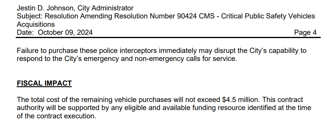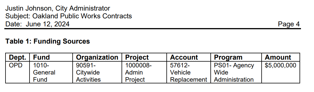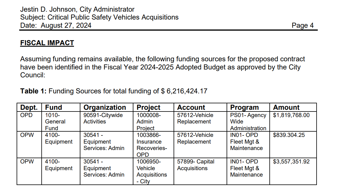 At issue is the City’s purchase of police cruisers that would replace OPD’s decrepit fleet. Oakland Public Works [OPW], the agency that purchases the City’s vehicles, brought the request to Council in mid-2024. At that time, Council approved the legislation to order over 60 new police cruisers from a local dealership, a total package that was then supposed to cost the General Purpose Fund aroound [GPF] $5 MM. But the effort coincided with what would be the beginning of several budget downgrades starting in mid-year.