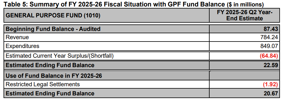 That surplus will nullify what would have been a budget shortfall of about $64.8 MM in this current fiscal year and leaves an actual positive projected balance at the end of the FY 25-26, according to the analysis, of about $20 MM. The current projection suggests that the OPD will come in at or even in surplus of their budget. But that's largely due to over budgeting for sworn positions—OPD was budgeted at over 60 positions more than any credible staffing projection would have yielded, and that extra funding will be used to pay off what is certain to be a typically high overtime figure. OPD is usually the driver of expenses in expenditure overages, but this year the expenses are projected to come in at around only $4 MM above projections due to overbudgeting. The problem here is that Oakland did not forecast its revenues nearly well enough to balance the spending, with the biggest outliers in property tax, sales tax and utilities taxes. The outcome again is troubling—the City still has no real rein on its police spending, despite pumping up its personnel budget to create an illusory positive balance, and will have even larger expenditures next fiscal year with only the promise of a new parcel tax and not much cushion otherwise to patch the difference.