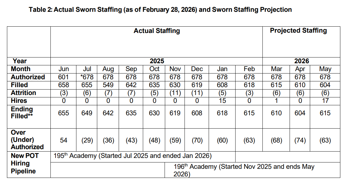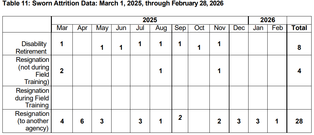OPD’s staffing report, current as of late February, shows an extended high attrition rate and low academy completion rate that combined has led to the plummeting police numbers. 30 officers have left since November, 2025 for example–an astonishing figure that's nearly equal to the total number of academy graduates expected for the fiscal year's worth of academies.