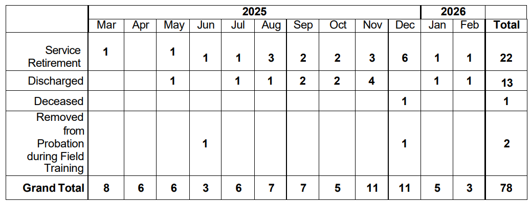 13 officers were terminated, per the data since that same date, another high water mark. Retirement remained high with 22 officers retiring during that same period.