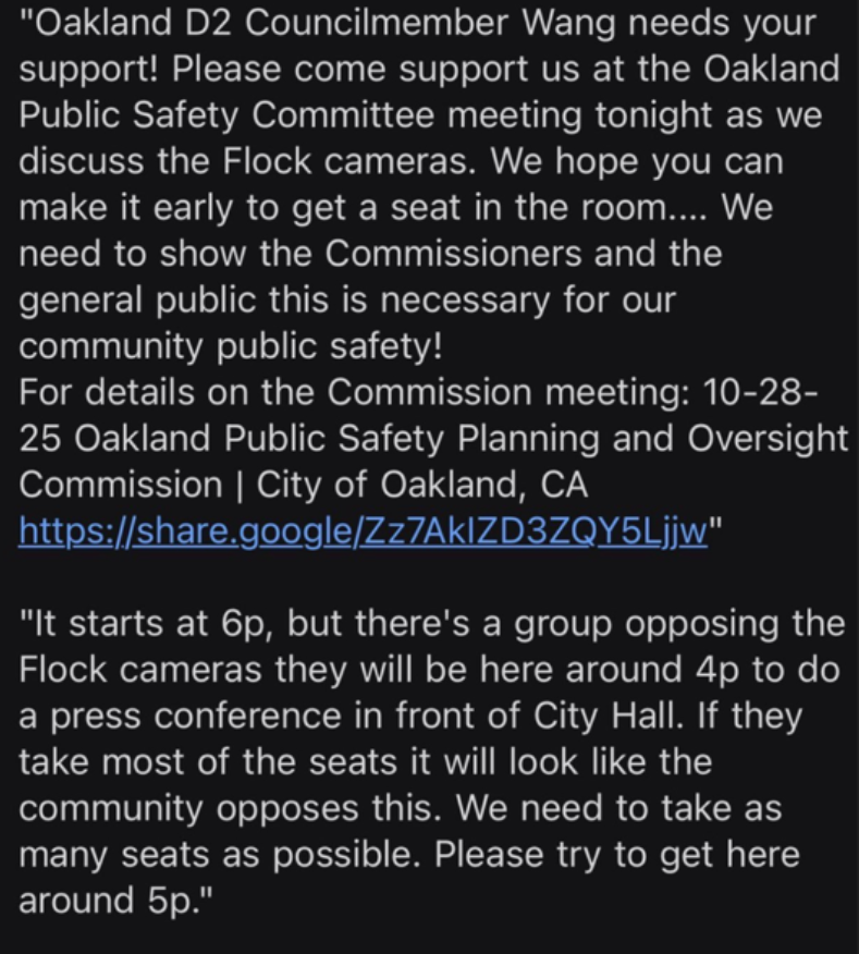 After weeks of feints and fakes, OPD’s quest to take over and expand the City’s CHP-initiated Flock surveillance system will finally come before the Oakland Public Safety Committee on Tuesday at 6pm. The committee’s chair, CM Charlene Wang, first tried to avoid scheduling the Flock contract and use policy to her committee by asking Rules Chair Kevin Jenkins to send it directly to Council. When that failed, somehow the public safety committee where it was scheduled was cancelled—leaving dozens of community members concerned about Flock in an era of Trump’s unpredictable law enforcement agencies in the lurch at the last minute. Then the OPD itself tried to avoid the Public Safety Committee review by appealing to the Rules committee.