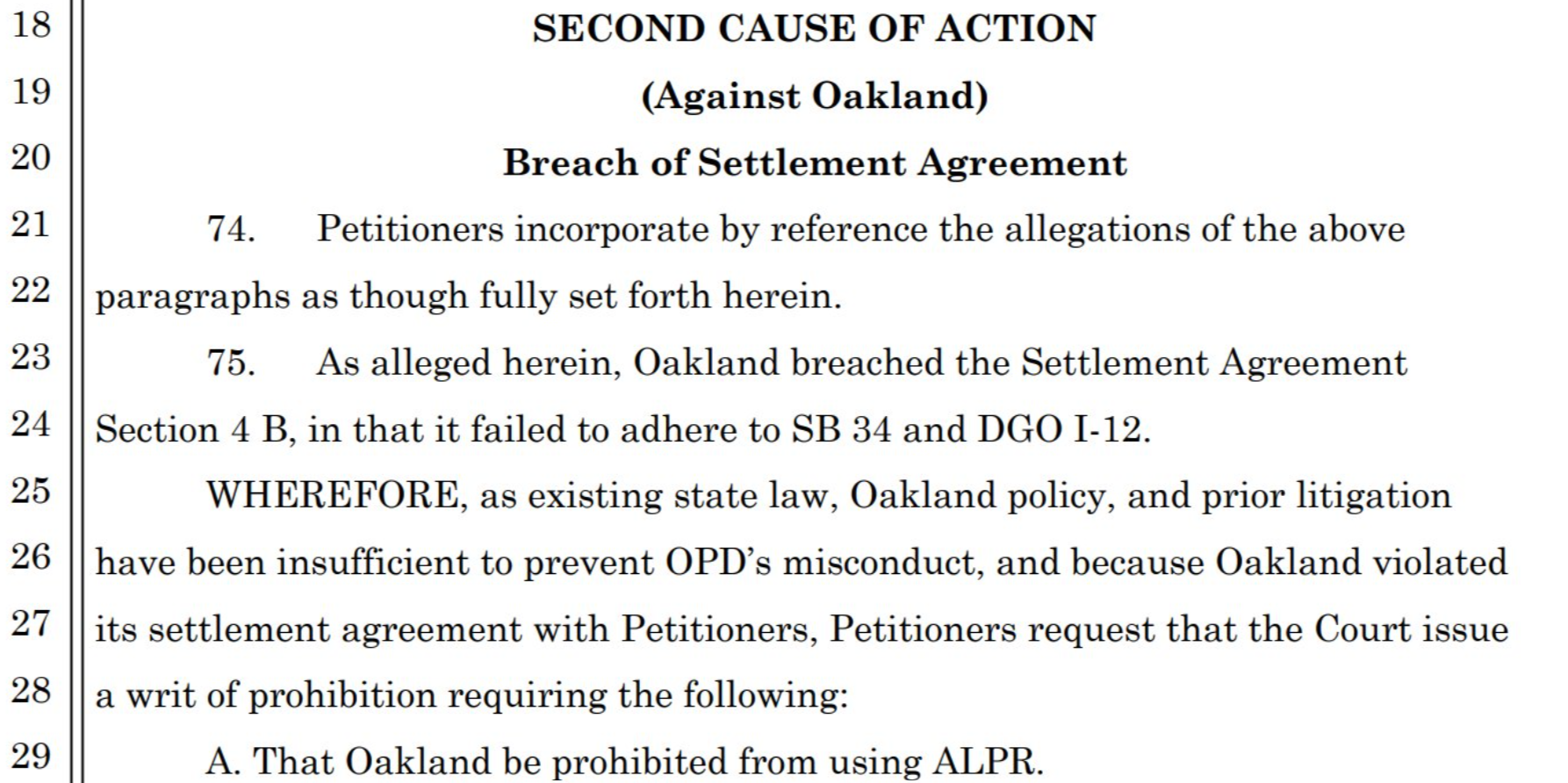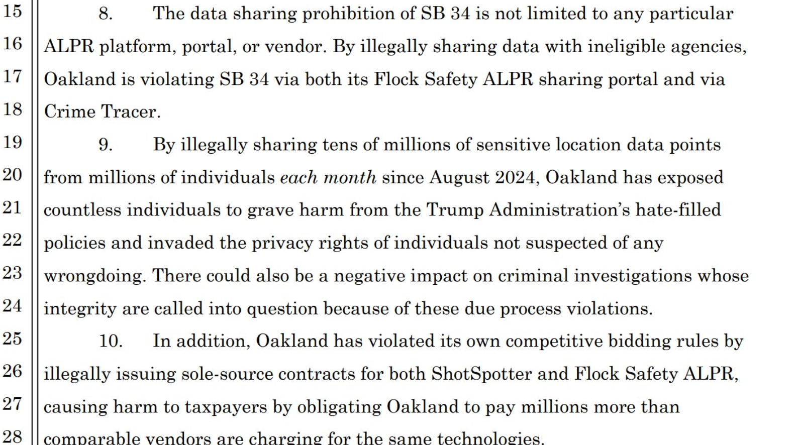 Today, Brian Hofer and Secure Justice are filing suit against the City of Oakland, alleging that OPD has failed to follow state law governing ALPR use, as well as its own use policies, city laws and a previous settlement agreement. The suit alleges that OPD: has no way of overseeing third party use of its ALPR, and agencies regularly share data with Federal agencies and other state agencies; has shared data with Federal agencies against state law; violates the City's bidding process by arguing no other vendor can fulfill the contract, which is at odds with facts.
