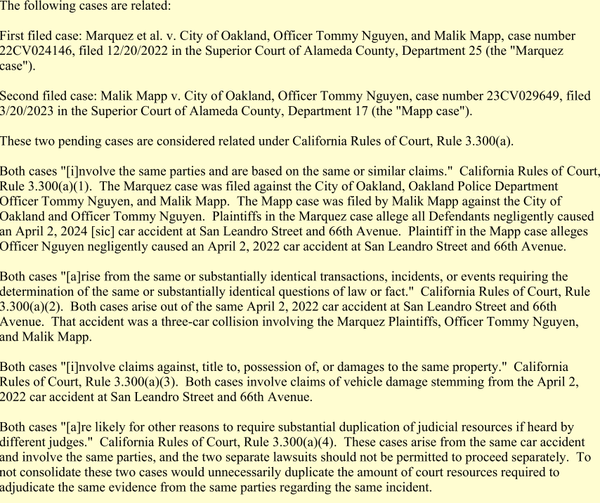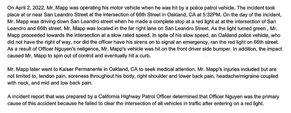 Mapp sued the City of Oakland for that collision a month or two later. Mapp's suit in the primary incident notes that a CHP collision report attributes the fault to Nguyen for running the red light. Mapp's suit says Nguyen did not have sirens on indicating emergency. Mapp, Hernandez and Gosvami all allege injuries from the accident. The court consolidated the lawsuits at some point, but the outcome of Mapp's suit against the City of Oakland litigated by John Burris, is unclear at this date.
