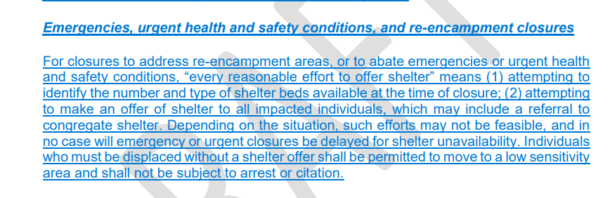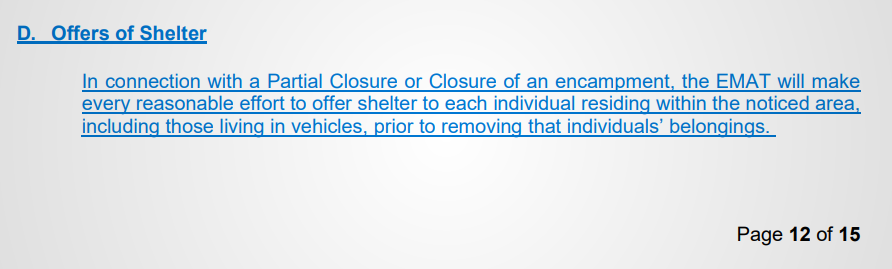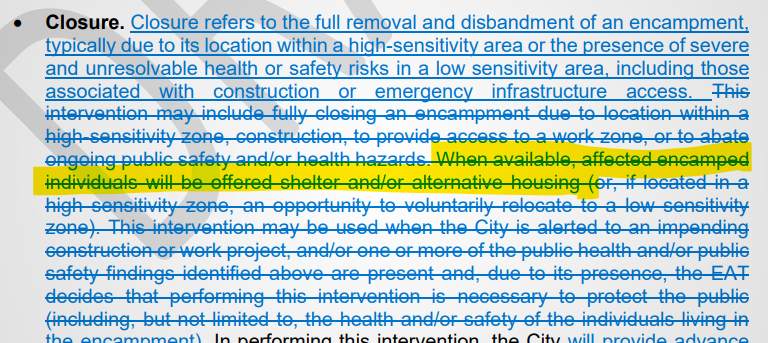The EAP now includes direction to make “every reasonable effort to offer shelter” in all encampment evictions, including requiring offers in some form to be made even in emergency situations. In the new version of the EAP, the City would keep its procedure of scheduling non-emergency encampment closures around available shelter capacity, instead of treating shelter for displaced individuals as an afterthought in the eviction process. The original EAP proposed that closures would be planned with no regard for shelter capacity, and shelter only offered “when available.”