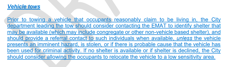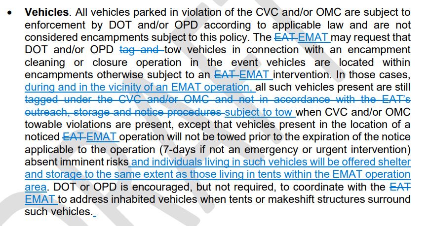 In the revised EAP, as in the original draft, a vehicle used as a dwelling is no longer recognized as an encampment for the purposes of the plan, and is subject to tow under most circumstances if the vehicle lacks registration and/or is parked illegally—a big change from current EMP policy. The state HCD and ICH appear to endorse this view, because the red line edits for the original EAP from ICH did not cross them out.