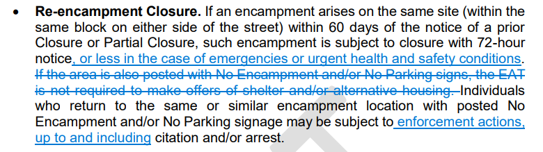 The original introduction of “Re-Encampment” Enforcement remains in the new EAP, but with slight modifications, including citation and arrest as a range of other unspecified “enforcement actions” and a requirement to make "every reasonable effort to offer shelter" during the closure. In notes made public by the City Attorney's Office, EAP co-author Brooks says that the section was added with full knowledge that OPD lacks the capacity to enforce the provision.