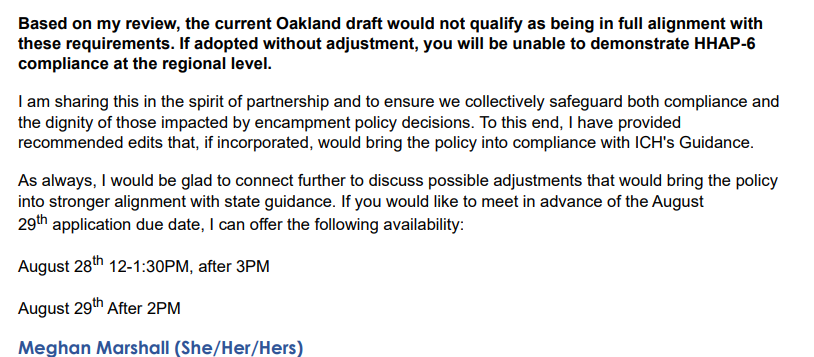 “Based on my review, the current Oakland [EAP] draft would not qualify as being in full alignment with these requirements. If adopted without adjustment, you will be unable to demonstrate HHAP-6 compliance at the regional level,” Marshal wrote in an August 27 email.