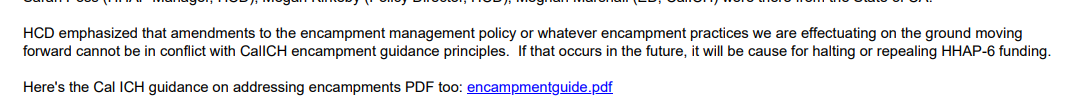 “Today we met with folks from CA State, as they requested in the attached letter, to discuss SAFE, HHAP-6, and encampment management policy in Oakland…HCD emphasized that amendments to the encampment management policy or whatever encampment practices we are effectuating on the ground moving forward cannot be in conflict with Cal ICH encampment guidance principles. If that occurs in the future, it will be cause for halting or repealing HHAP-6 funding,” the email reads.