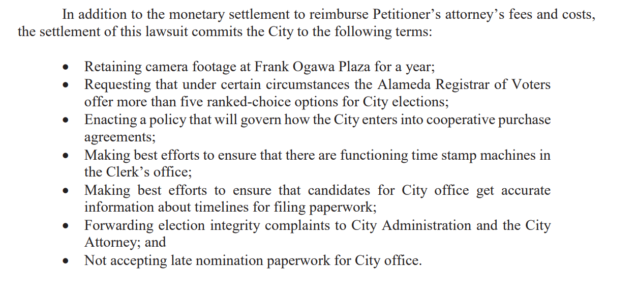 The City does not admit to culpability nor an invalid election process in the aftermath of a serious error by the Office of the Clerk in 2022. In the settlement, the City agrees to certain actions at the heart of the dispute and to pay $270K the petitioners attorney fees.