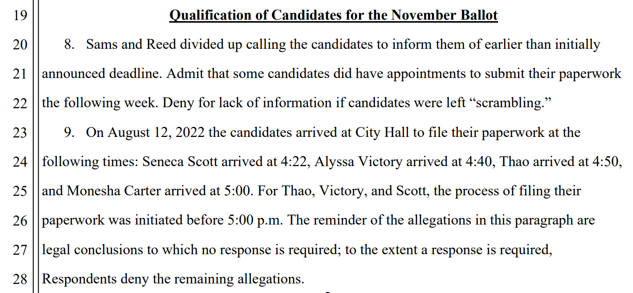 Though the City also commits to not accepting late paperwork, importantly the City doesn’t admit that it did receive paper work after 5pm. In documents rebutting Sacks’ arguments during the period that lawsuit was in process, the City directly responded that it believed that Thao and others filed their paperwork on time.