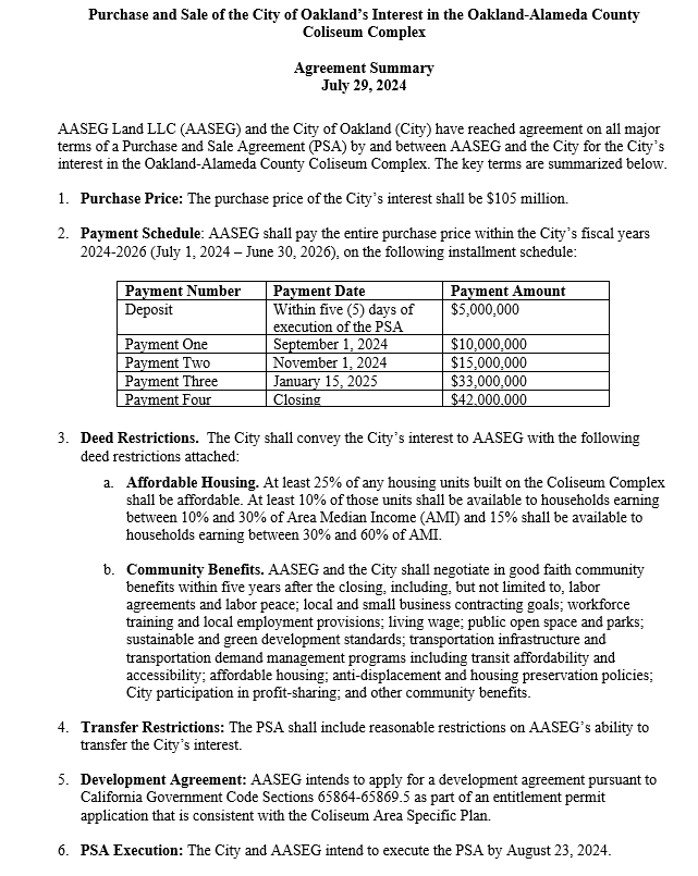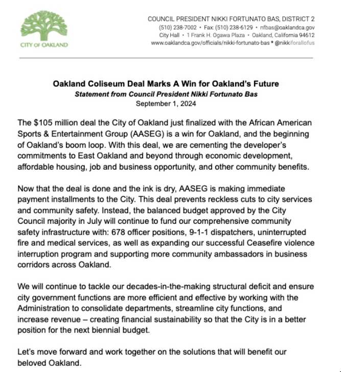 AASEG announced on Friday that it has signed the Purchase and Sale Agreement to buy the A’s 50% share of the Oakland Coliseum property. Then on Saturday night, Mayor Sheng Thao announced via social media that AASEG signed its much anticipated purchase and sale agreement with the City of Oakland for its corresponding share. The announcements came late into the night on both Friday and Saturday. Sources with direct knowledge of the negotiations told the Oakland Observer that in both cases, the City, A's and AASEG were confident as early as August 23 that the sales would be executed, but the complexity of the process caused the timeline to extend beyond the projected target dates to close the sale.