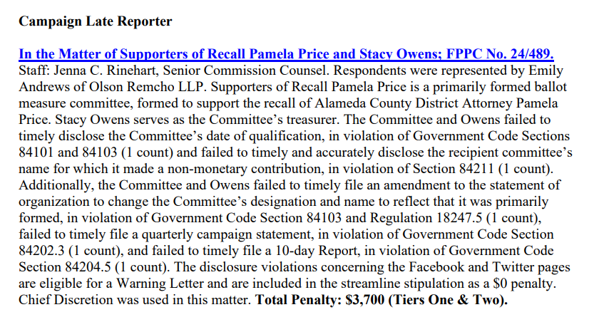 The Fair Political Practices Commission [FFPC] fined “Supporters of Recall Pamela Price” aka, Reviving the Bay Area, a finance committee started by Philip Dreyfuss, for campaign finance law violations, according to an FPPC Report. Dreyfuss was a founding partner in the SAFE campaign finance committee primarily focused on raising funds to recall ALCO DA Pamela Price—his partner principals in the effort were Brenda Grisham, Carl Chan, and the contracted campaign accountant Sonia Hidalgo of Dean and Company. Several months later, Dreyfuss' name disappeared from the SAFE paperwork, as he founded another finance committee, Reviving the Bay Area along with Isaac Abid and contracted accountant Stacey Owens of S.E. Owens. As the Treasurer of record, Owens bears legal responsibility for the actions and is thus named in the documentation. The total fine is $3,700.
