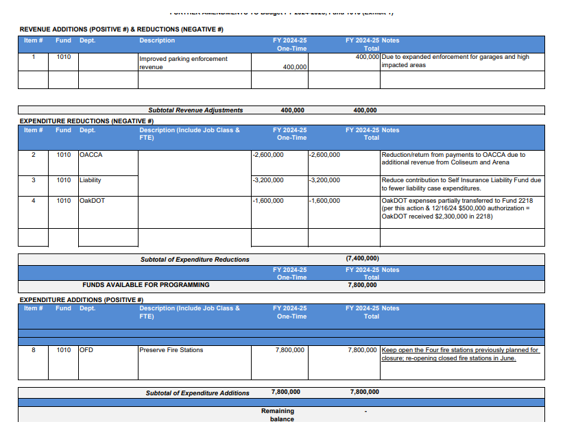 At a March 4 Council meeting, CMs Janani Ramachandran, Rebecca Kaplan and Zac Unger are scheduled to introduce revenue-allocating legislation that would keep open four Oakland firehouses slated for closure in December’s spending cut plan. The proposed OFD re-funding plan—which the City Administrator’s Office [CAO] supports and has already incorporated into the City's spending plan—will be juxtaposed alongside a Q2 revenue and expenditure report from the Finance Department that shows an improved, but still dire, projected General Purpose Fund [GPF] budget deficit.