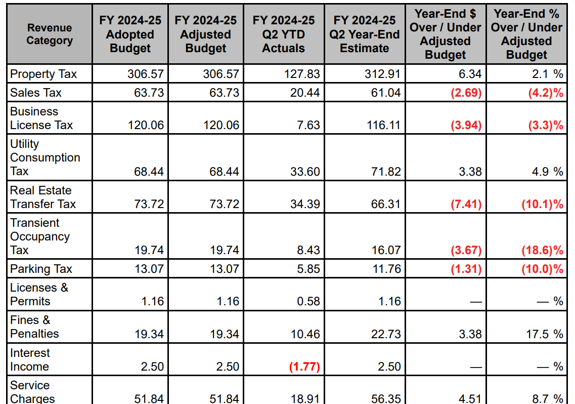 As of December, the end of the 2024-25 fiscal year second quarter, the City is still projected to come in at $89 MM* over budget, according to the report—with the important caveat that many of the CAO’s cost-reductions began as the second quarter was ending and afterward. In the report, the Finance Department says that the balancing actions are expected to right the budget by year’s end with a minor surplus.
