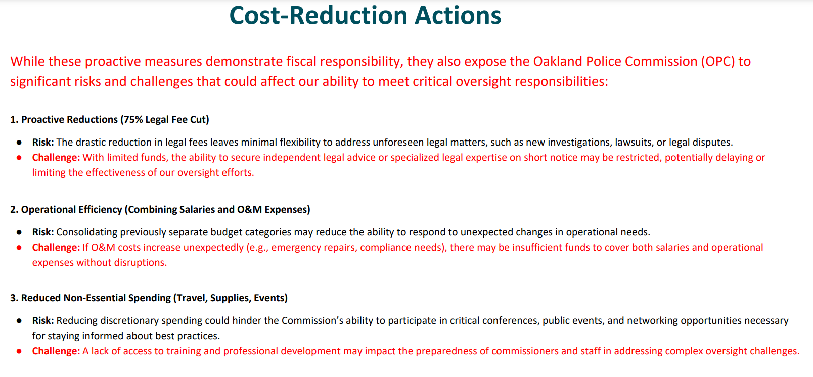 Last Thursday, the Oakland Police Commission laid out a bleak budgetary future that will have its budget pared down to 6 figures in a latest round of cuts. The proposed cuts come after several previous reductions over the budget initially proposed in the FY 23-25 budget passed in June of 2023. As the City’s poor budget prospectus has come into focus, the OPC and the two bodies it oversees, the Community Police Review Agency [CPRA] and the Office of the Inspector General [OIG], have seen their budgets slashed—at the mid-cycle in July, then in November due to the adoption of the City’s “contingency” budget, and now in a third round of cuts imposed by the City Administrator in the Mayoral interim. All told the Police Commission and its oversight bodies face an over 70% cut from what was initially proposed a year and a half ago.