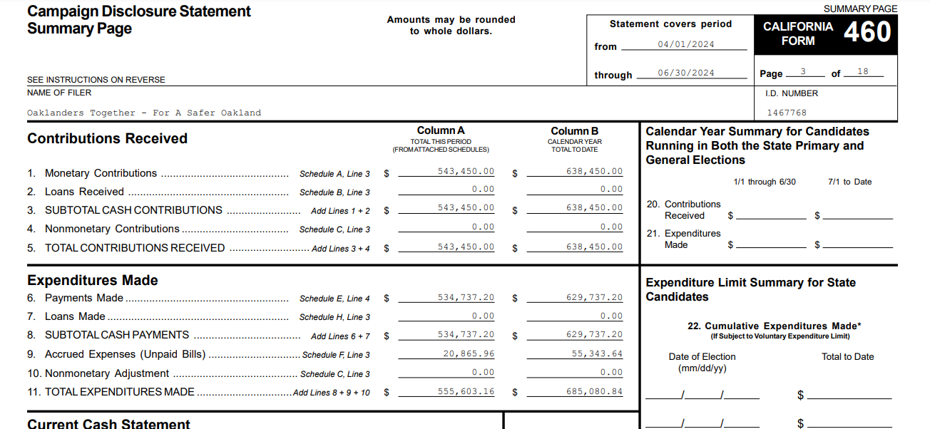 SOS Oakland is the latest campaign financing vehicle by Greg McConnell, long a lobbying fixture at the City of Oakland with a wealth of Oakland clients that include the Duong family’s California Waste Solutions. McConnell's last independent expenditure committee, Californians for Safer Streets, was dedicated to the mayoral campaign of Ignacio de la Fuente, who went on to fall out of the ranked choice run off early in the count. About three quarters of the of the $712K in funds raised and spent were from one person, Jonathan Brooks, the financier behind the attempt to bring coal to Oakland, who donated over half a million dollars.