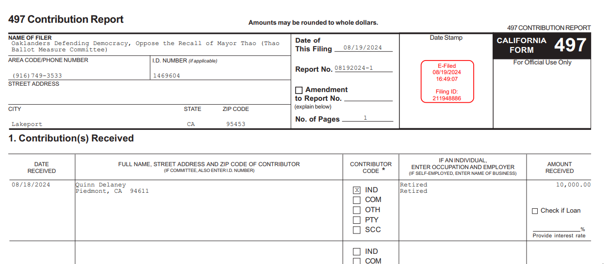 *shortly after publication, Thao's recall IE, run by Thao, received its first large donation, $10K from the Chair and Founder of the Akonadi Foundation. Delaney's contribution represents the first significantly large independent amount within the 90 day window when all contributions over $1K must be reported within 24 hours.