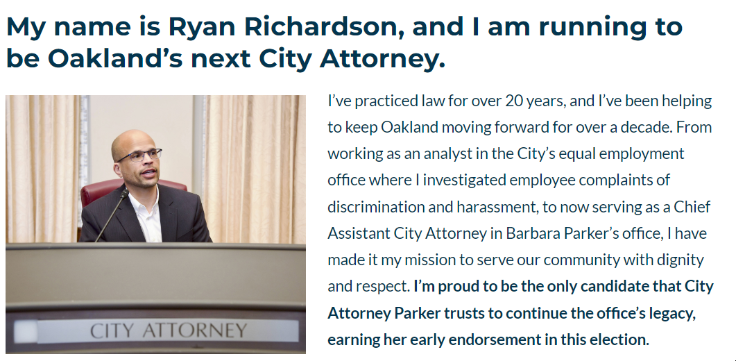 Several donors that gave money in opposition to current City Attorney Barbara Parker in her last election in 2020, contributed to Harbin-Forte's opponent, current Assistant City Attorney, Ryan Richardson in this cycle. That’s noteworthy, because Richardson has stated that he intends to continue in Parker’s footsteps. In campaign literature, Richardson says that he is “the only candidate that City Attorney Parker trusts to continue the office’s legacy”. Parker has endorsed Richardson.