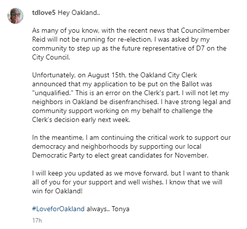 Iris Merriouns, D4 CM Janani Ramachandran’s Chief of Staff and formerly Chief of Staff for Larry Reid, qualified to run for the district by Friday. And two-time Mayoral candidate and current City of Oakland contractor Ken Houston also qualified, per the Clerk's office. Tonya Love, according to the City of Oakland clerk, did not initially qualify, but Love disputes the result and is fighting for the certification this coming week, per her social media statements.