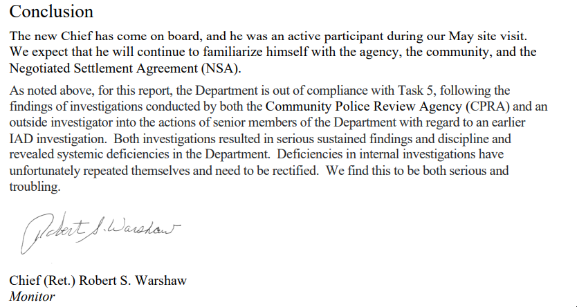 Those investigations were referenced by Warshaw this month as the motivation for his decision to find the OPD out of compliance on IAD investigations, a central task required for exiting the NSA and one that the OPD still appeared within reach of satisfying months ago.