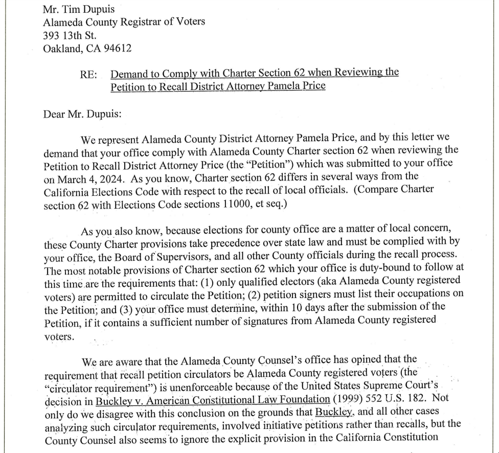 Price’s legal representative, James R. Sutton, of The Sutton Law Firm, this week also sent the ROV a letter outlining the Charter-specific process expected from the ROV. Sutton notes the ALCO Charter mandates that: