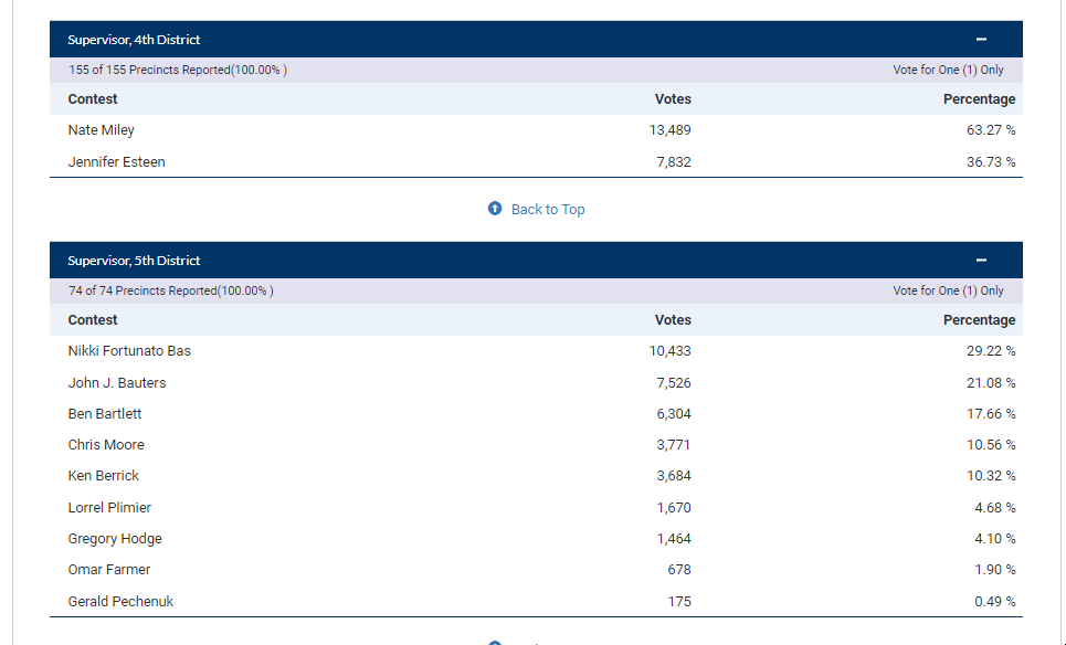 —Bas is likely to be the major vote holder for ALCO BOS D5, but will be shy of the 50% needed to avoid a runoff in November. Bauters will likely be her opponent in November.