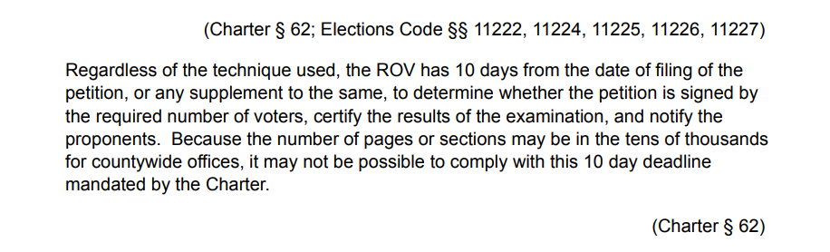 The ROV under Tim Dupuis has stated that the office regards the signature-gatherer voter registration in the charter rules to be unconstitutional. But Sutton’s firm has informed Dupuis at least twice over the past several months that the firm regards Dupuis perspective unfounded and has cautioned him to observe the registered voter requirement. The ROV has also admitted publicly and in documents that that the verification most likely can't be completed in 10 days.