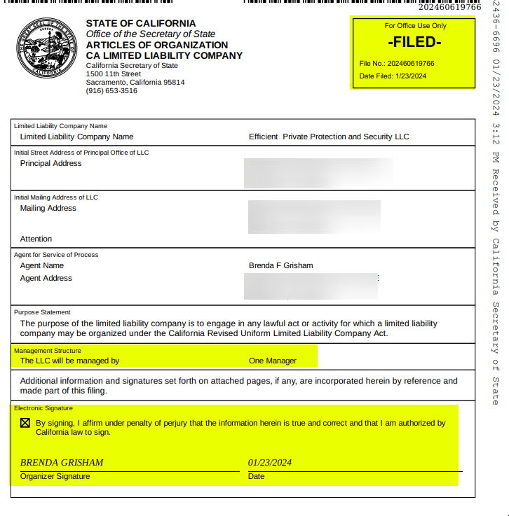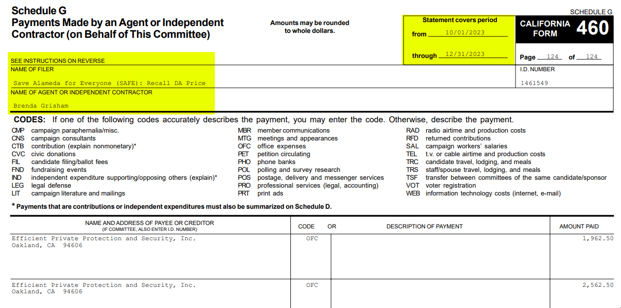 Price-Recall Campaign head Brenda Grisham expensed payments to the campaign for a security firm she herself founded in late January, a new campaign finance report reveals. Grisham appears to own the company—Efficient Private Protection and Security, LLC [EPPS]—which was registered under Grisham’s name just a month and a half ago on January 23, 2024, according to Secretary of State documents. The reports show that Grisham, acting as an agent of the campaign, allegedly paid EPPS, apparently her own company, $4,525.00 in the period between October 1 and December 31, 2023. An East Bay Times report cites Grisham's own claim that she has already been reimbursed for the amount by the campaign.