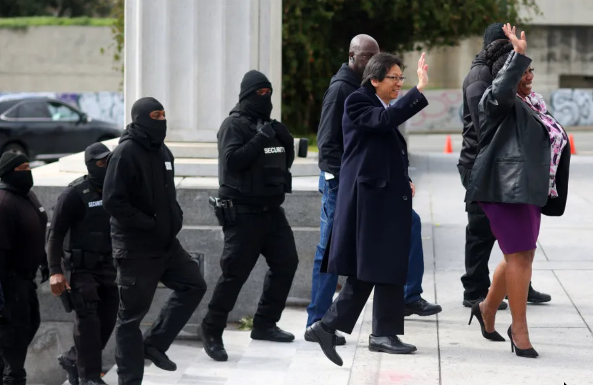 It’s not clear why the information wasn’t included in the original report, or why it is only coming to light this week, after campaign principals Carl Chan and Grisham arrived at the Renee C Davidson courthouse flanked by armed men masking their identity in order to turn in what they claim is well over 100K signatures for the recall of DA Price. As startled witnesses and viewers of the event observed, the men had no corresponding company-identifying information and were dressed in black with patches that said security, but not wearing uniforms. Several carried handguns on hip holsters.