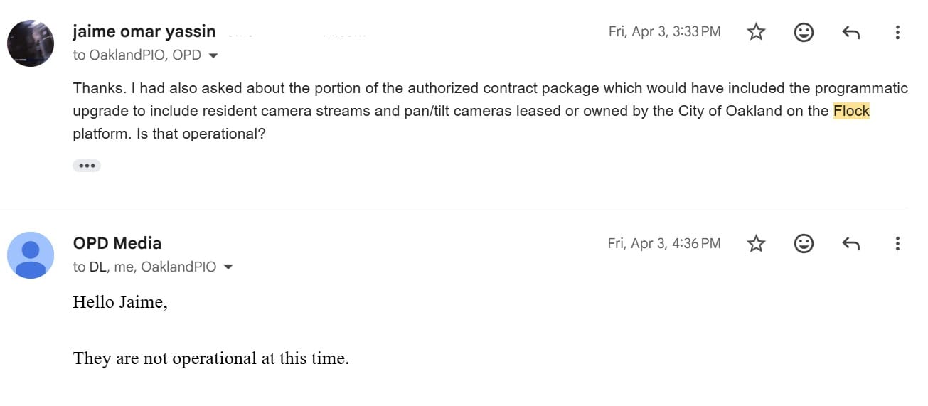 OO first confirmed that OPD hadn't yet signed the contract in January, and has confirmed the ongoing absence of the contract every month, with the most recent confirmation Thursday, April 16. OPD has declined to provide any information for the ongoing per diem use of Flock or whether or not the memorandum of understanding with the CHP continues. This remains an Oakland Observer exclusive, as no other media organization has reported that the contract authorization, controversial at the time it was passed in December, has yielded no contract.