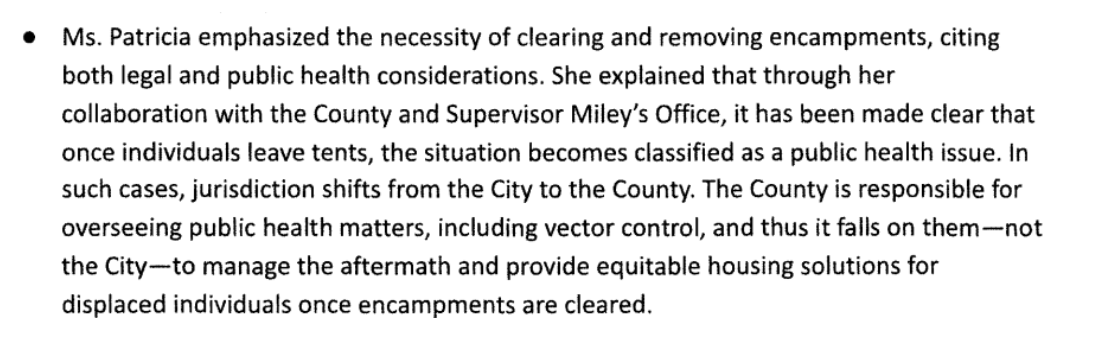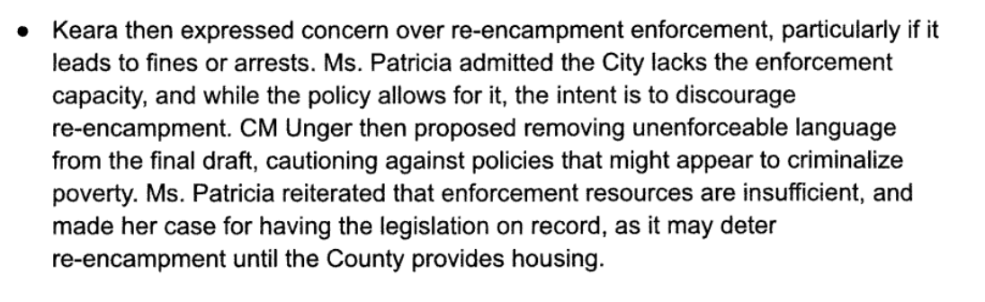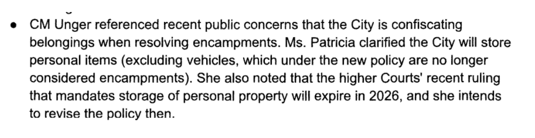Brooks, representing both Jenkins office and Houston's, told CMs as well that the EAP ultimately envisioned an end to current practices of preserving homeless residents property based on the Mirelle settlement. Criminalizing all re-encampments was also a central component of the legislation as presented by Brooks to other CMs.