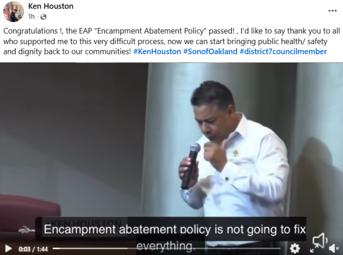 And CM Noel Gallo, often a reliable ally of Houston’s on the dais, refused to vote for the policy. Embedded in a rambling soliloquy that included an uncharacteristic acknowledgement that homelessness is driven by increasing rents and cost of living, was Gallo’s contradictory implication also that the powers to evict RVs and vehicles are already held by OPD and OakDOT.