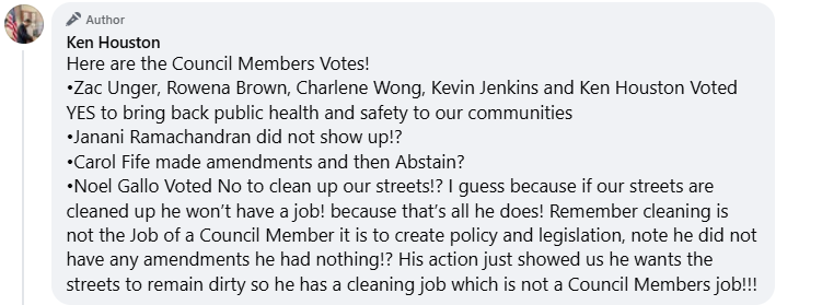 The EAP that finally passed Council with a narrow 5 vote majority was visibly different from both Houston’s vision and the legislation he introduced almost a year ago, but on Wednesday Houston turned to Facebook to boast of the success, regardless. But that was followed by a surprisingly bitter reprise in the same thread that aired a familiar dynamic of grievances. In a subsequent post, Houston attacked fellow CMs he did not view as loyal to his vision. His focus on Gallo reveals he still stands by his original claims that the EAP would by itself significantly reduce homelessness, an idea none of the CMs who voted for his policy appeared to believe.