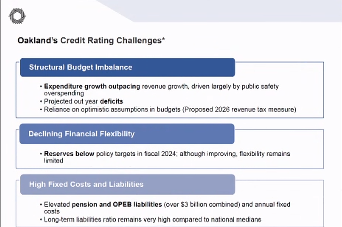 Oakland’s credit rating is still comparable to those of other mid-sized cities, according to PFM’s Jaime Trejo, who told Council members that Oakland’s rating is “average” for a city of comparable size. But Trejo’s presentation suggested that “overly optimistic outlooks” in budgeting were partially responsible for the credit rating ding in late 2025. The City’s Treasury Administrator David Jones later went further and specifically noted that the main onus of that criticism was the ballot measure patch in the 26-27 budgeting.