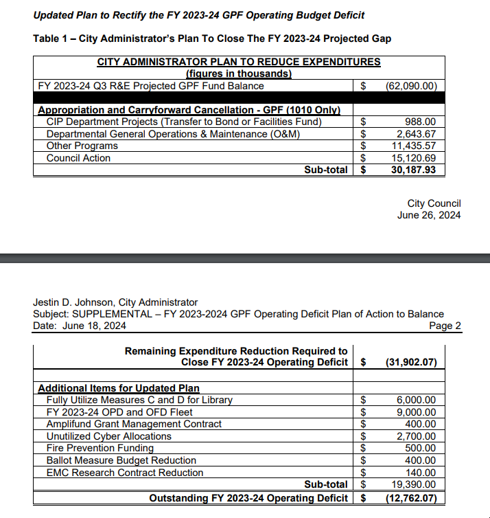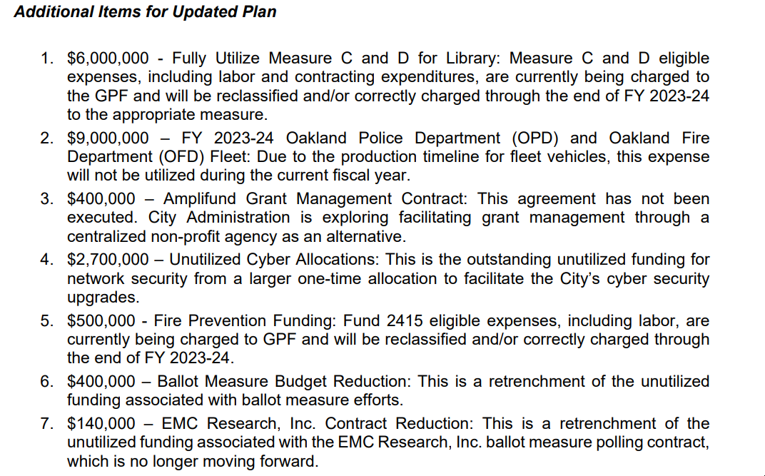 In the new formula, the City is utilizing the entire available $30 MM of the cuts. That leaves $30 MM to close in the new formulation. Now, the City Administrator says, $19.3 MM of that will be resolved through the following actions, including canceling a new $9 MM OPD/OFD fleet, & $6 MM use of library bond measure on library expenditures.