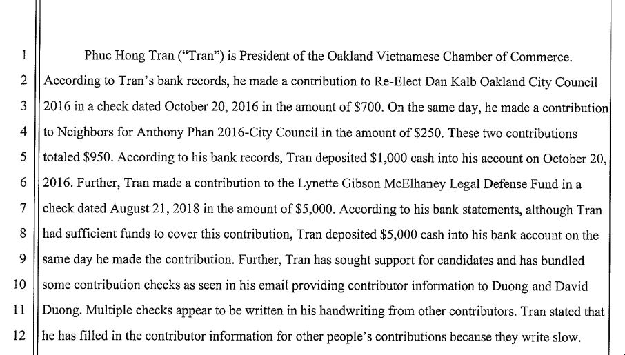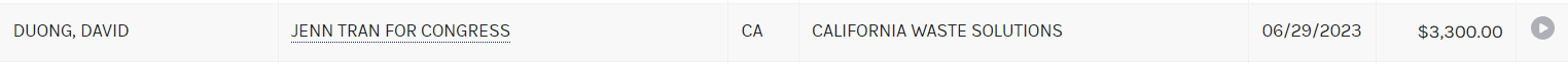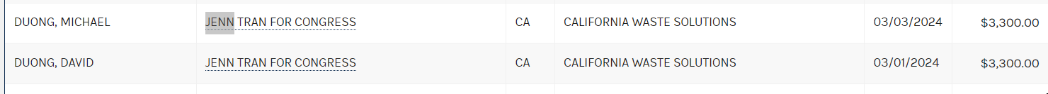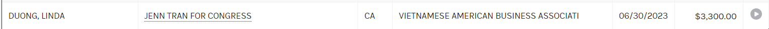 The elder Tran is still a board member of the Vietnamese Chamber of Commerce of Oakland where Tran is now President. The elder Tran was also suspected of his own bundling and straw donor operation, all according to a Fair Political Practices Commission complaint from 2021. Tran received around $13k in donations from the Duong family for her congressional run.