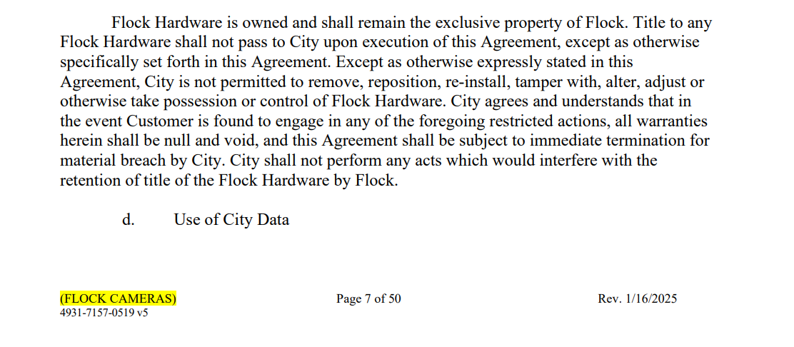 —and the reality behind Flock’s contractual ownership of the cameras was revealed when Evanston, Il discovered Flock has absolute power to remove the cameras and had to cover them with trash bags to ensure the public would not be recorded against the city government’s will. Oakland's Flock contract has similar language.