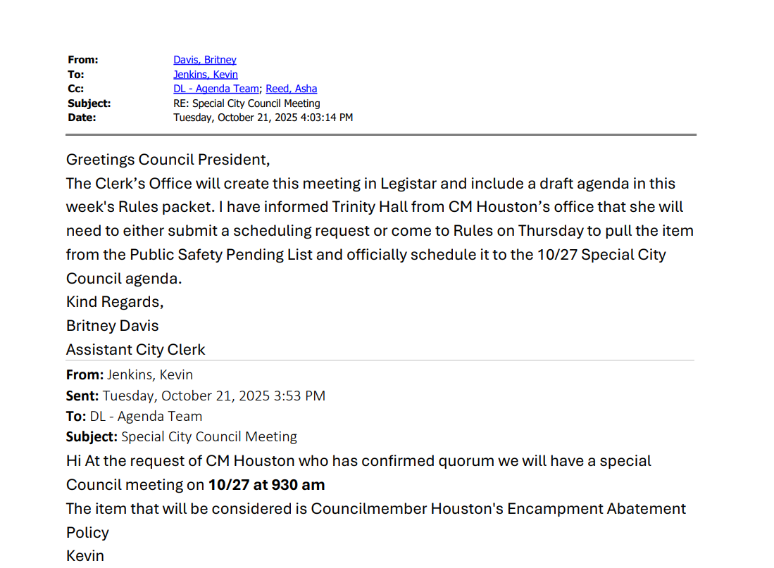 An email received from a public records request shows that the next week, during the October 21 Council meeting, Jenkins directed the Clerk’s office to schedule a special meeting for October 27 for the EAP. Jenkins received scheduling confirmation within minutes—but Jenkins did not inform the public about the scheduling during the remaining three hours of the meeting.