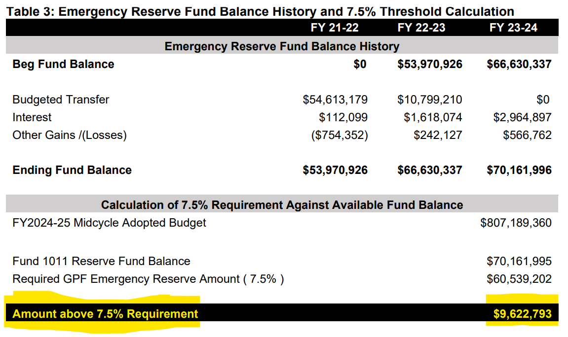 In the new report and legislation, the City Administrator now says the emergency fund is not only solvent, it’s at a $10 MM surplus–and that surplus is being transferred to the general purpose fund to tackle the deficit. The deficit is also about $14 MM higher as well at $129MM [due to additional carryforwards, including Head Start funding, according to the report].