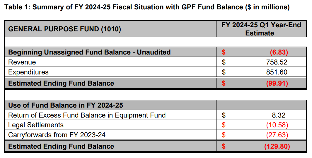“given there is no possibility of replenishing the reserve this Fiscal Year, the City will be required to declare a Fiscal Emergency per the Consolidated Fiscal Policy (CFP), following the conclusion of the Audit and publication of Annual Comprehensive Financial Report,” [Fiscal Year 2024-25 First Quarter Report, November 8, 2024 from Finance Director Erin Roseman].