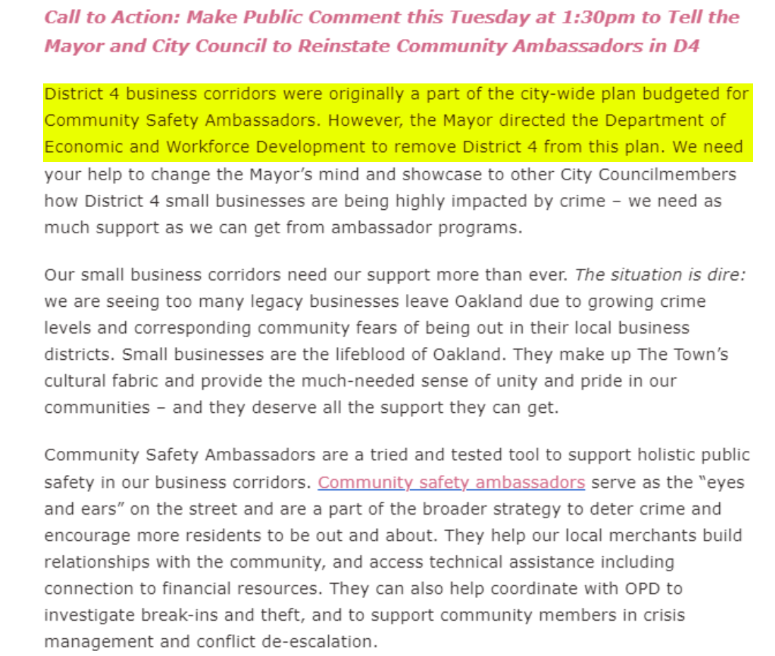 The Economic and Workforce Development Department [EWD] bringing the grant request asked the Rules committee to use an urgency finding to schedule the grant to the forthcoming Community and Economic Development [CED] meeting. EWD argued that a primary focus of the grant was to make the funds available in time for the holiday season. Ramachandran, who had a prior engagement during the meeting where the ambassador grant was to be scheduled, argued that the item should be delayed so that she could personally be involved in the deliberations. Ramachandran said that she represented residents and businesses of Oakland that won’t see the benefit of the grant, and apparently focused on diverting some portion of the limited funds to the Dimond and/or Laurel districts in D4.