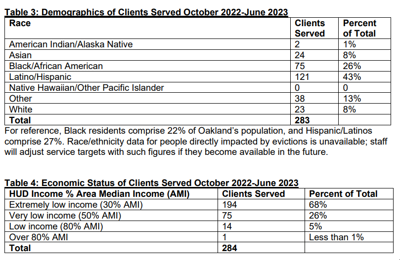 The report details that Centro continued to serve more Latino households than any other household group, the next largest group served was Black households—26% of the services were to Black households, a proportion slightly higher than Oakland’s Black population. The program’s Latino participation was 47%, a much higher proportion than Latino representation in Oakland. Only 8% of the households served were Asian, a number lower than the representative population. Nearly all of the households served were either very low income or extremely low income [the majority at 68%].
