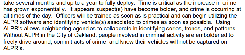 OPD/City staff successfully argued to the Rules committee this week that the ALPR legislative package should bypass the Public Safety Committee as an urgency item. Tracy Jones, OPD's Police Services Manager, argued that increased crime necessitates an expedited timeline for ALPR and that oversight from the Privacy Advisory Commission earlier in the month obviated the additional committee oversight. Jones also noted that OPD currently has no “active” ALPR system—though she did not mention that OPD turned off its own system earlier this year after proving unwilling or unable to meet the previous use policy passed by Council.