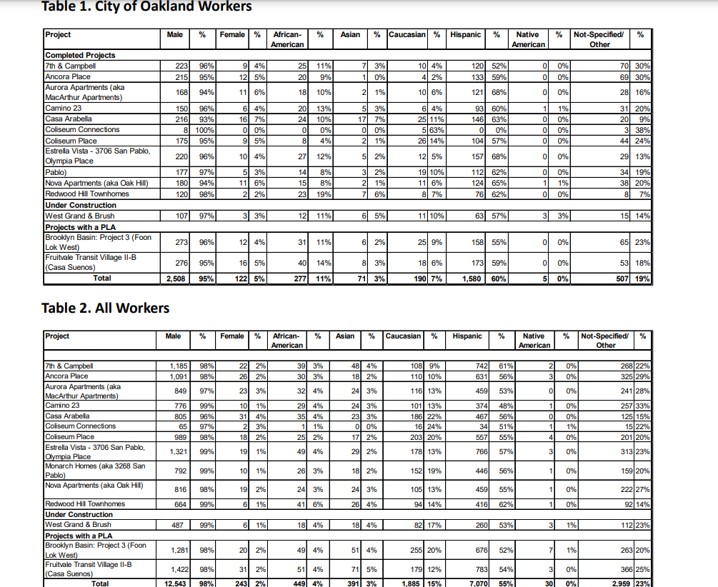 The outcome in the small data set for the MA1 PLA relegated to Brooklyn Basin has mixed but uninspiring outcomes. When looked at as a proportion of Oakland residing workers, the Brooklyn Basin project had higher Black Oakland resident participation than the average. But the number is dwarfed when compared to the share of the workers on site from greater Alameda County. Workers from Alameda County represent around 5 times Oakland’s workforce on the Brooklyn Basin project. As a percentage of the entire workforce on the job, Oakland’s Black population represented only 4% of the workforce, lower than its share in the County's construction workforce. Oakland workers were responsible for less than half the work hours on the Brooklyn Basin project.