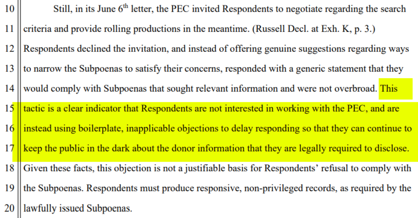 On Wednesday, July 24, Spain published a tentative ruling denying mandatory compliance with PEC’s subpoenas—in her ruling, Spain argued that the subpoenas were overbroad and even unconstitutional. A tentative ruling is not the final ruling in a case, and is usually provided so that parties have the option to contest it at a final hearing—the parties are allowed to contest the ruling, and though very rare, a judge can change some or all of their ruling.
